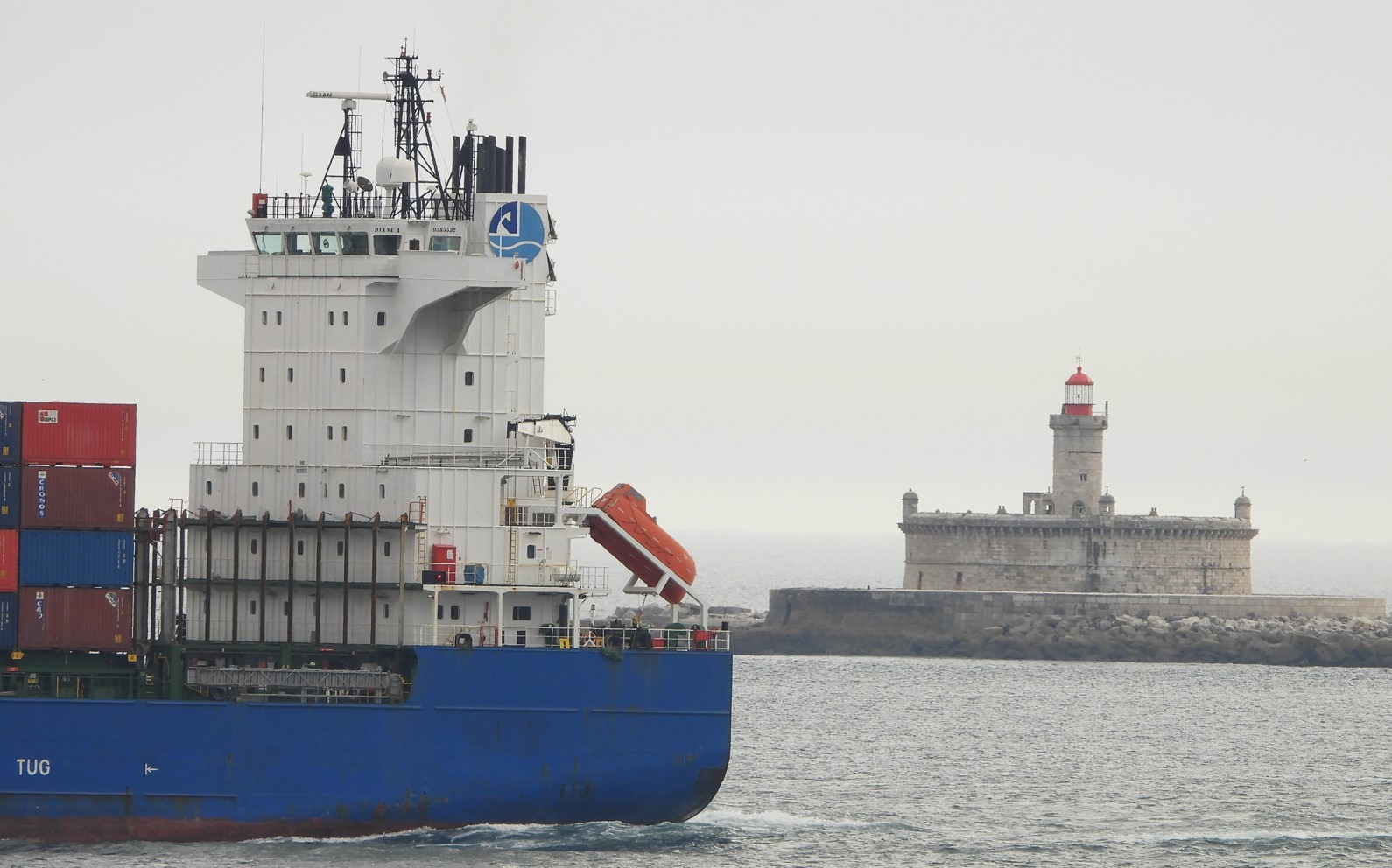 O porta contentores Diane A, entrando a barra do rio Tejo, vindo do porto de Leixões em mais uma viagem que o levará até às ilhas de Cabo Verde, com escala nas ilhas Canárias.